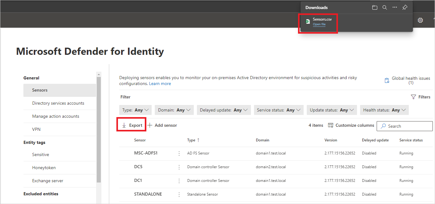 - For Defender for Identity standalone sensor on a dedicated server, select the network adapters that are configured as the destination mirror port. These network adapters receive the mirrored domain controller traffic.On the Sensors page, select Export to export a list of your sensors to a .csv file. For example: