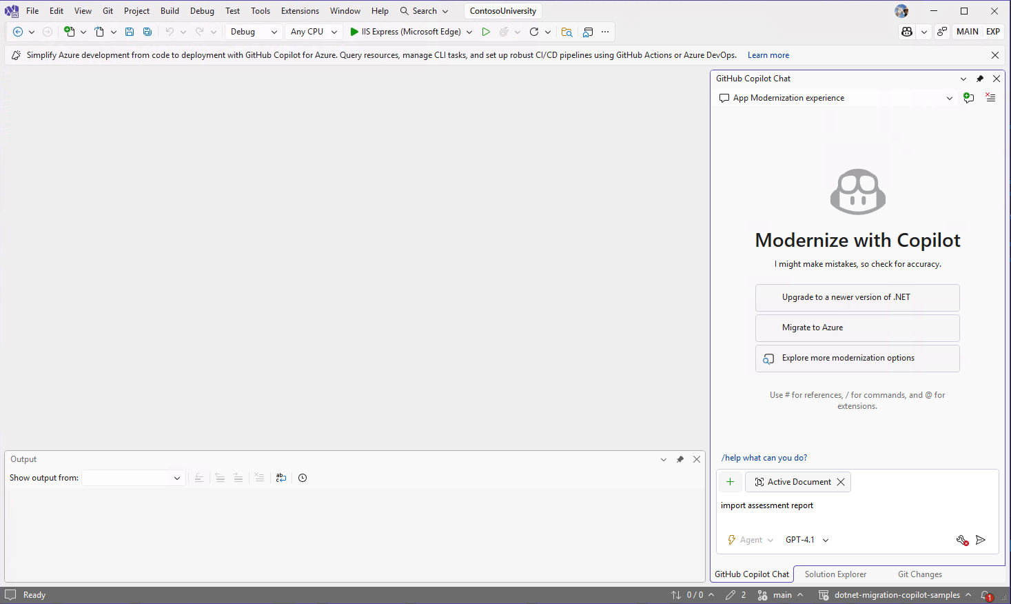 You can trigger importing a report by typing "import assessment report" in the chat when you enter the Modernize agent, or select the Import button in the assessment dashboard to import the report from the file explorer.