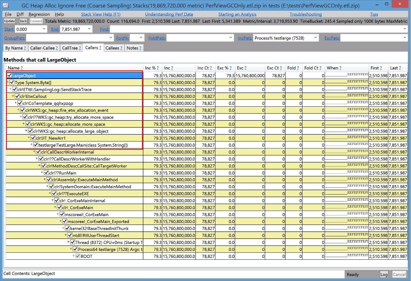 collects an AllocationTick event, which is fired approximately every 100k worth of allocations. In other words, an event is fired each time a large object is allocated. You can then look at one of the GC Heap Alloc views, which show you the callstacks that allocated large objects: