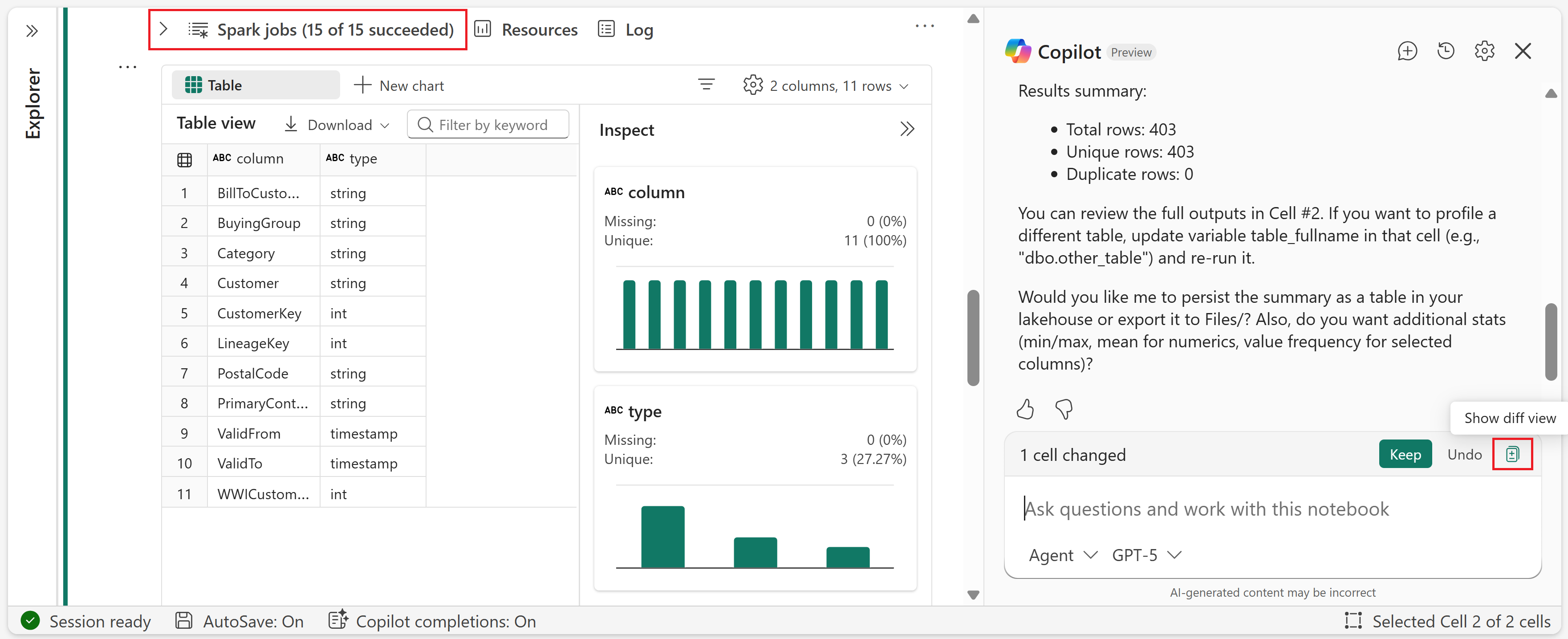After the Spark job completes, you can choose to Keep or Undo the changes to the notebook. You can also open the diff view to see exactly what Copilot changed.