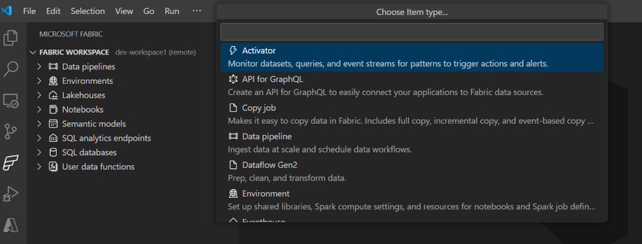 With the Microsoft Fabric Extension, you can now create, delete, and rename any Fabric item directly within VS Code, streamlining your workflow without ever leaving VS Code. You can also view the newly created items in Fabric portal.