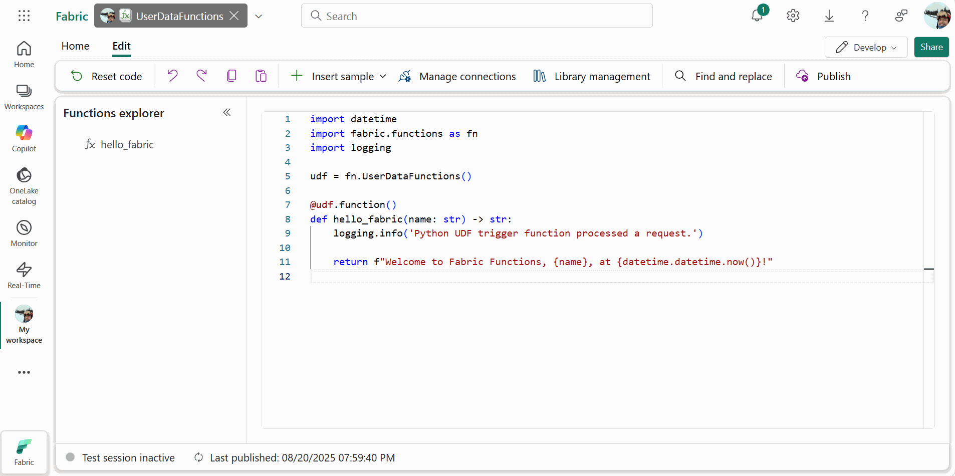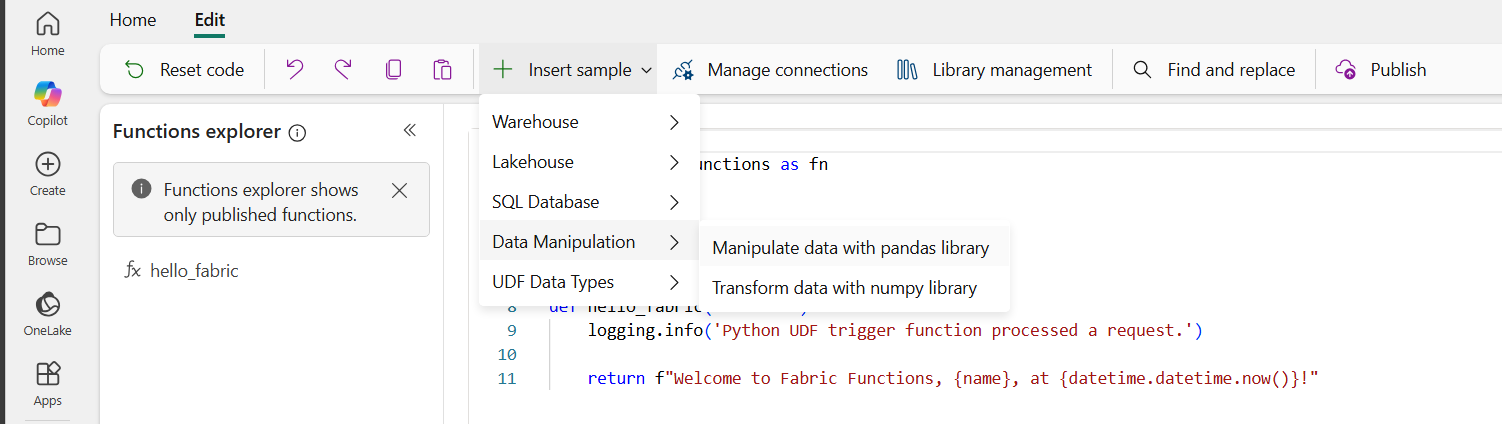 hello_fabricPython function template. The Functions explorer shows all the functions that are published and ready to be invoked.Once the