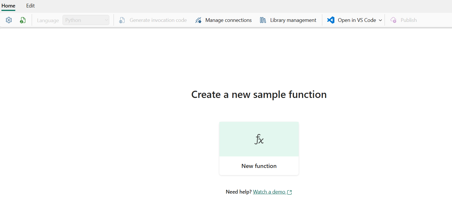 In this guide, we will create a new User Data Functions item and write new functions in it. Each User Data Functions item contains code that defines one or many functions that you can run individually.