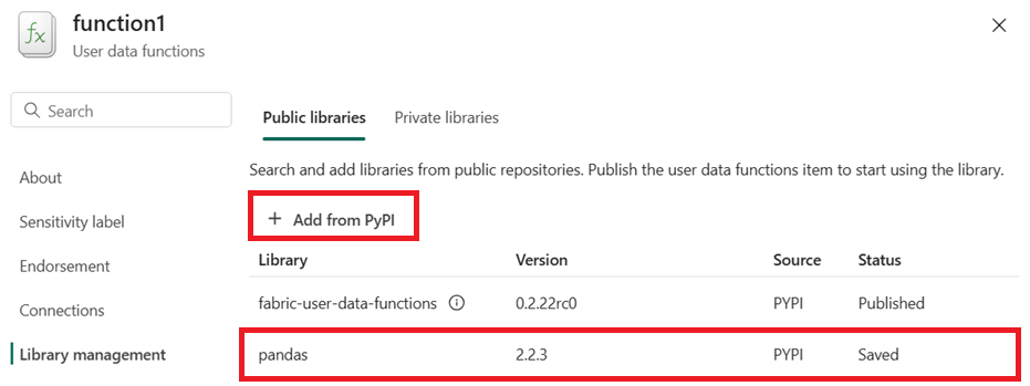 fabric_user_data_functionslibrary is added by default and can't be removed. This library is required for the functionality of User data functions. You need to update the version of this library for any future releases of this SDK.Select pandas library and select the version. Once the library is added, it's automatically saved in your User Data Functions item.