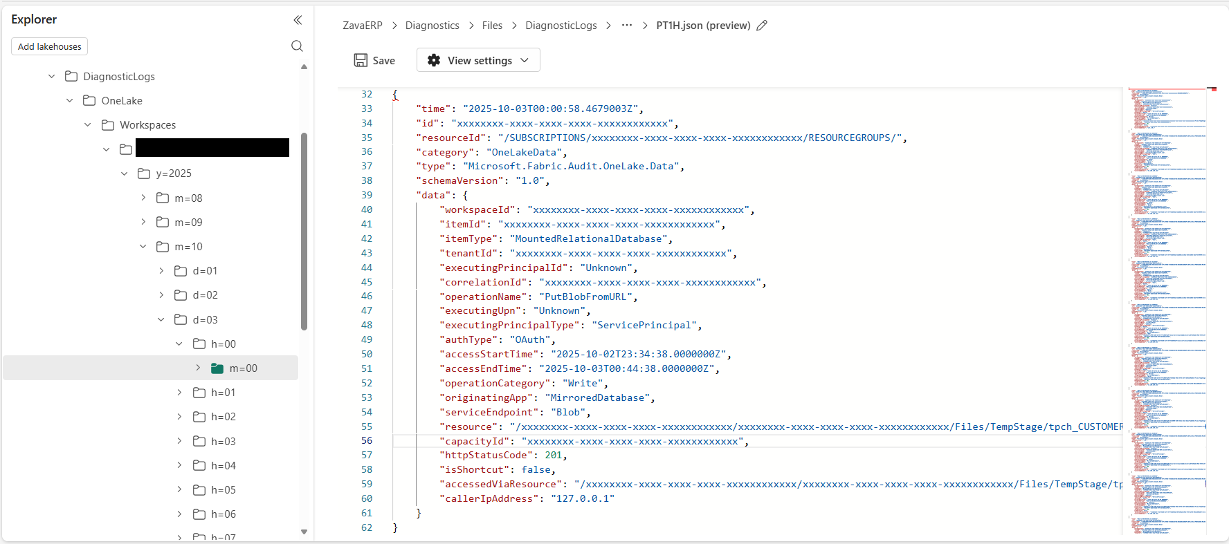 OneLake diagnostic events are stored in the DiagnosticLogs folder within the Files section of a Lakehouse. JSON files are written to a folder with the following path: Files/DiagnosticLogs/OneLake/Workspaces/WorkspaceId/y=YYYY/m=MM/d=DD/h=HH/m=00/PT1H.json