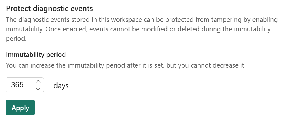 The immutability period is configured on the workspace that contains diagnostic events. To configure the immutability period, you must have previously configured a workspace to store diagnostic events in this workspace. The immutability period applies to all events stored in this workspace.