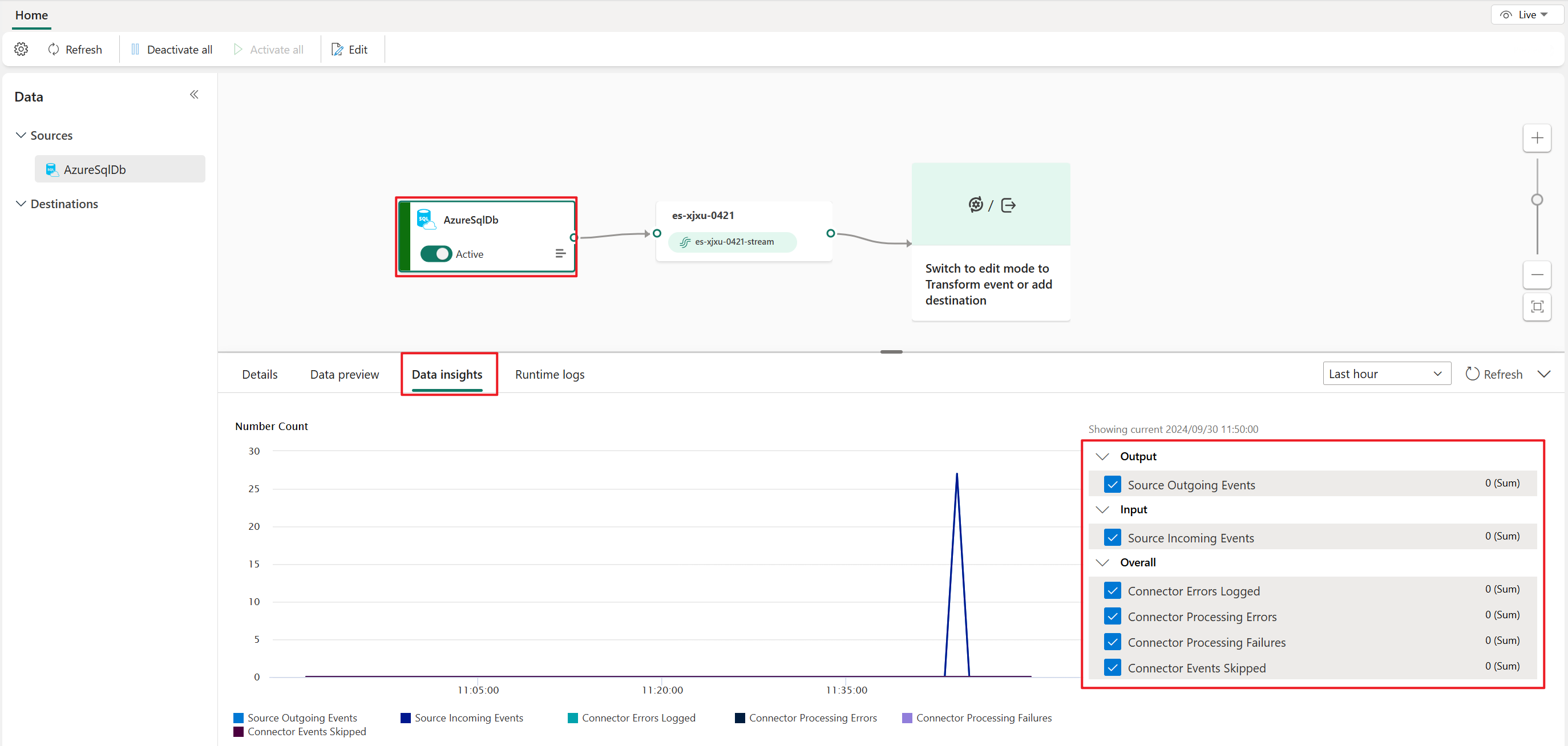 The Data insights tab appears on the lower pane of the main editor. The tab provides metrics that you can use to monitor the status and performance of the eventstream, sources, and destinations. Different sources and destinations have different metrics.