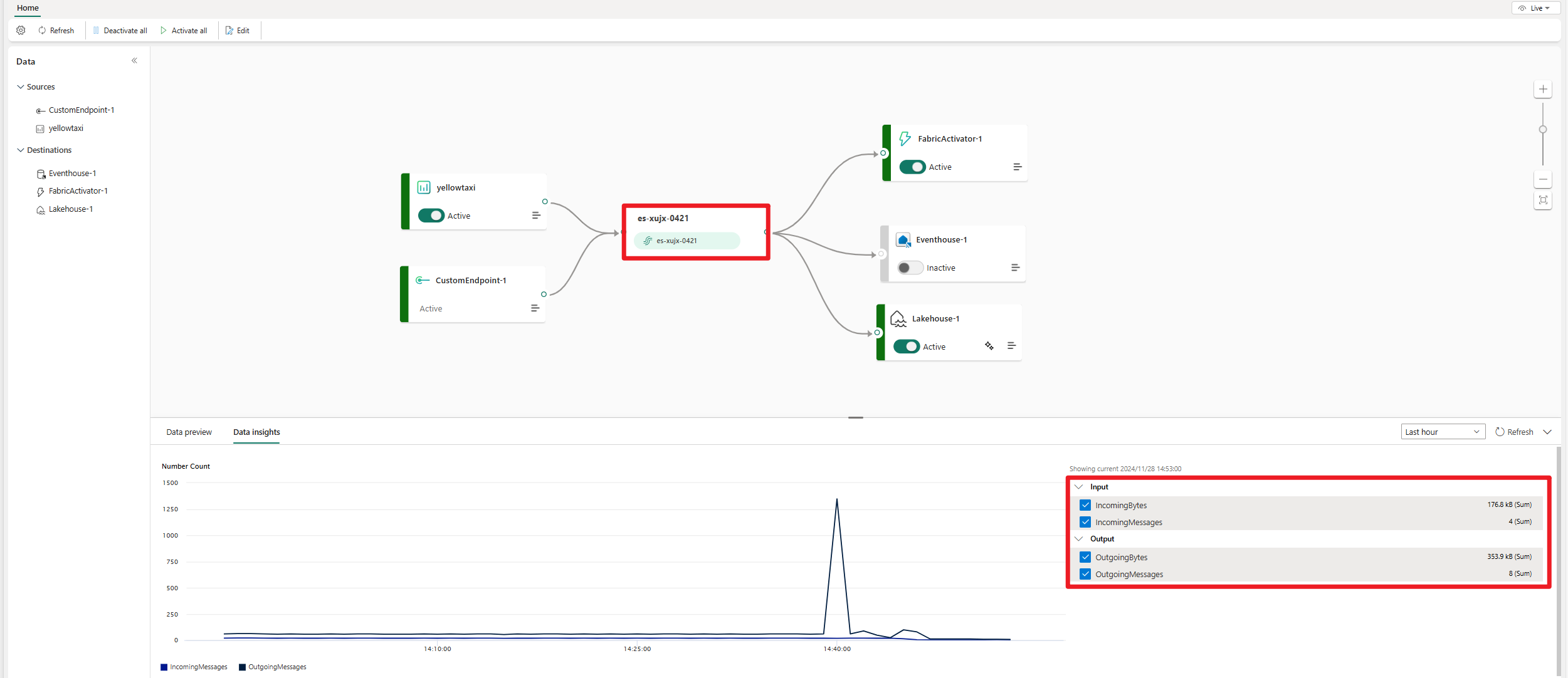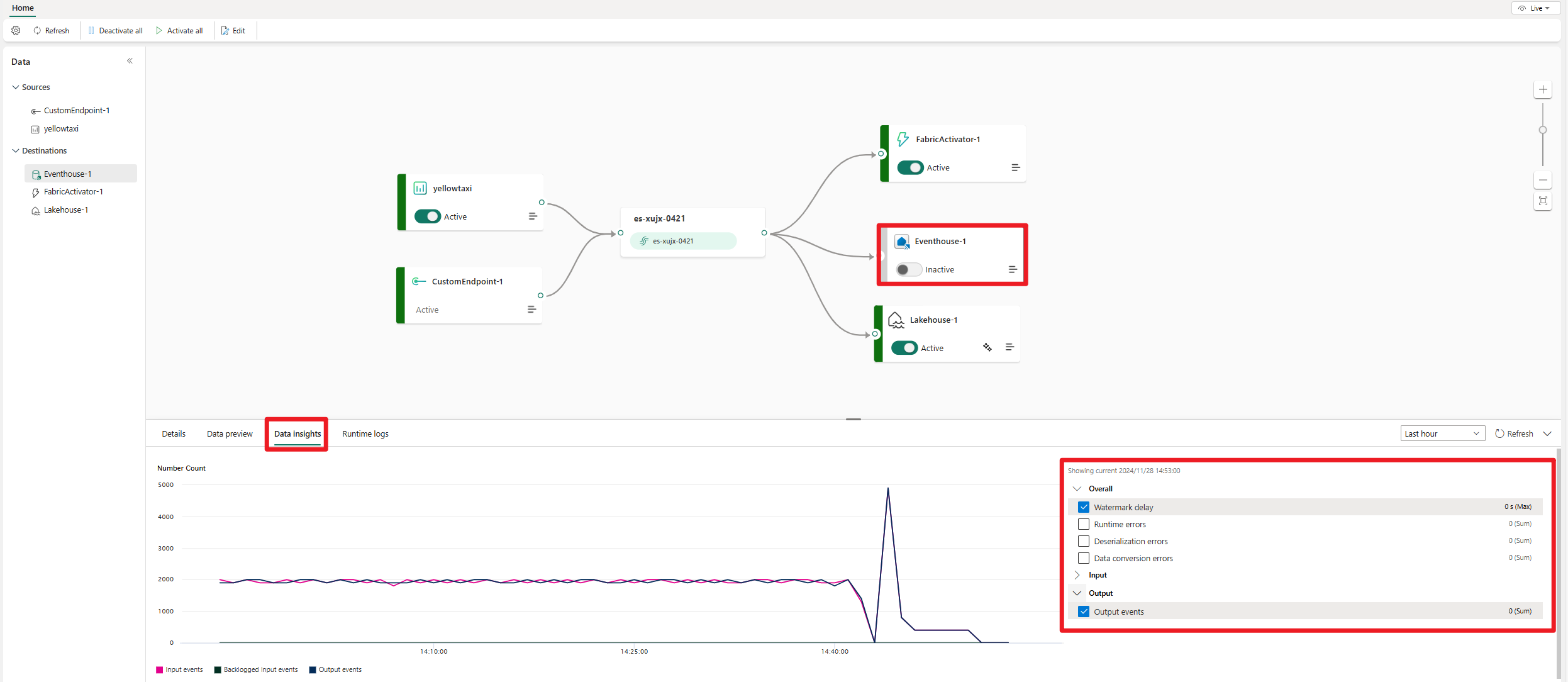 Data insights for Azure Event Hubs, Azure IoT Hub, lakehouse, eventhouse, derived stream, and Fabric Activator nodes