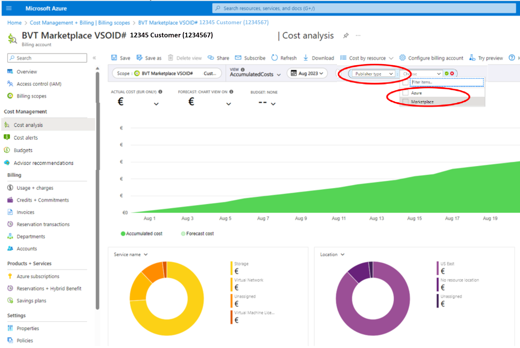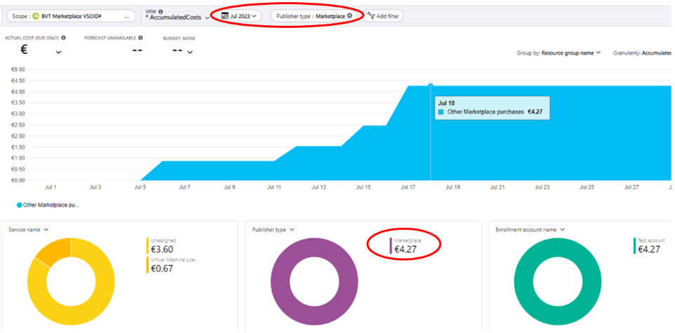 When you select the publisher type filter for Marketplace, you view only Microsoft Marketplace charges for the selected timespan: