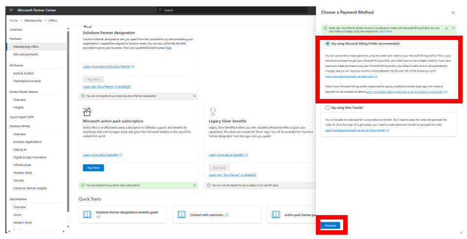Select Pay by Microsoft Billing Profile, then select Proceed.