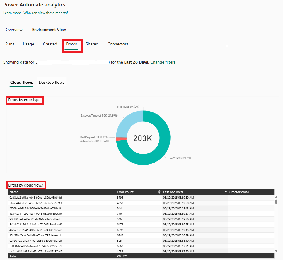 Selles aruandes antakse ülevaade korduvatest tõrketüüpidest ja üksikasjadest, nagu tõrgete arv, looja meiliaadress, viimase tõrke ilmnemise aeg ning iga voo looja meiliaadress.