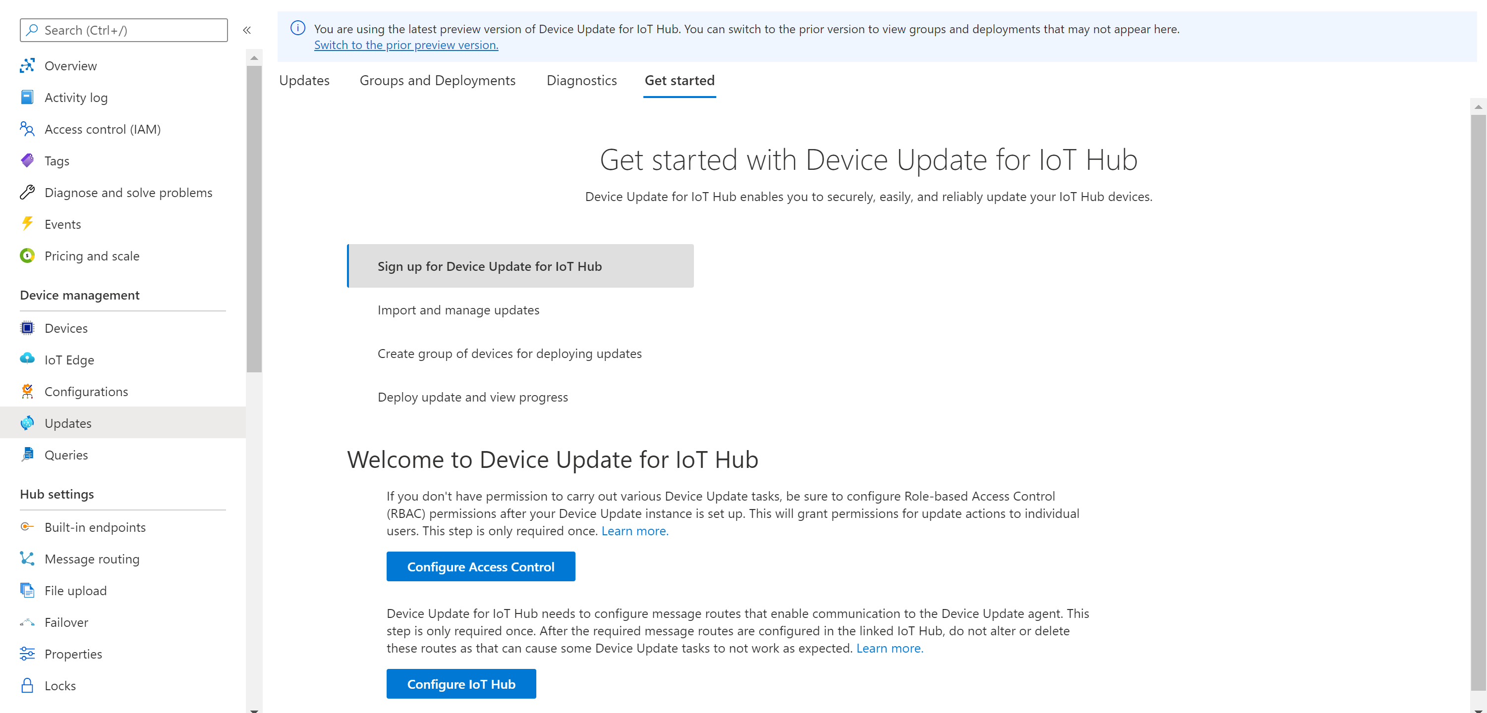 - Access to an IoT hub with Device Update for IoT Hub enabled. We recommend that you use an S1 (Standard) tier or above for your IoT Hub instance.