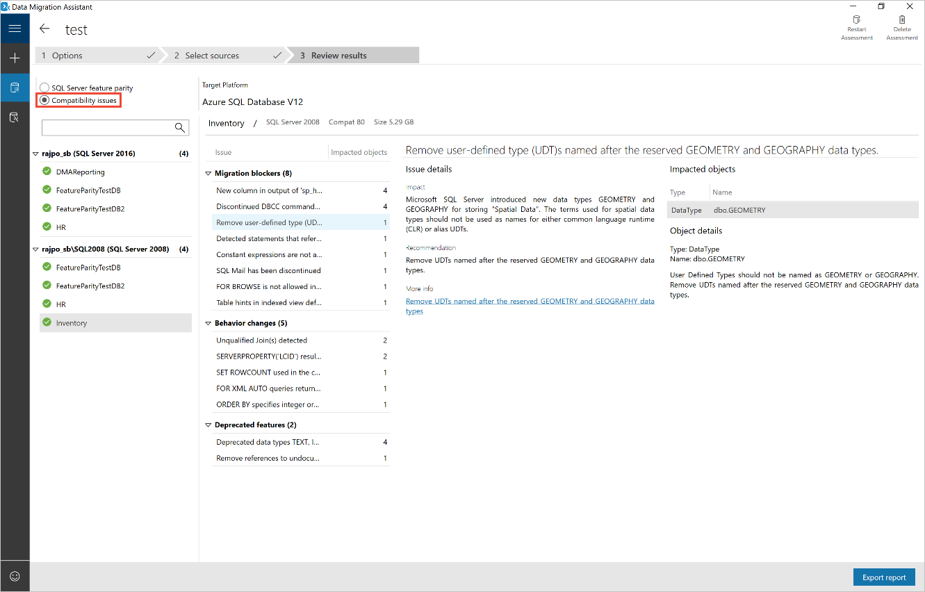 When assessing your source SQL Server instance for migrating to Azure SQL Database, you can choose one or both of the following assessment report types: