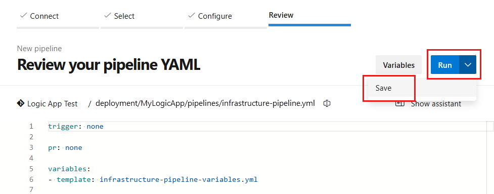 Para Ruta de acceso, seleccione la ruta de acceso que se usará para la canalización. Esta ruta de acceso es el valor predeterminado: deployment/{logic-app-name}/pipelines/{infrastructure-pipeline-name}.yml.