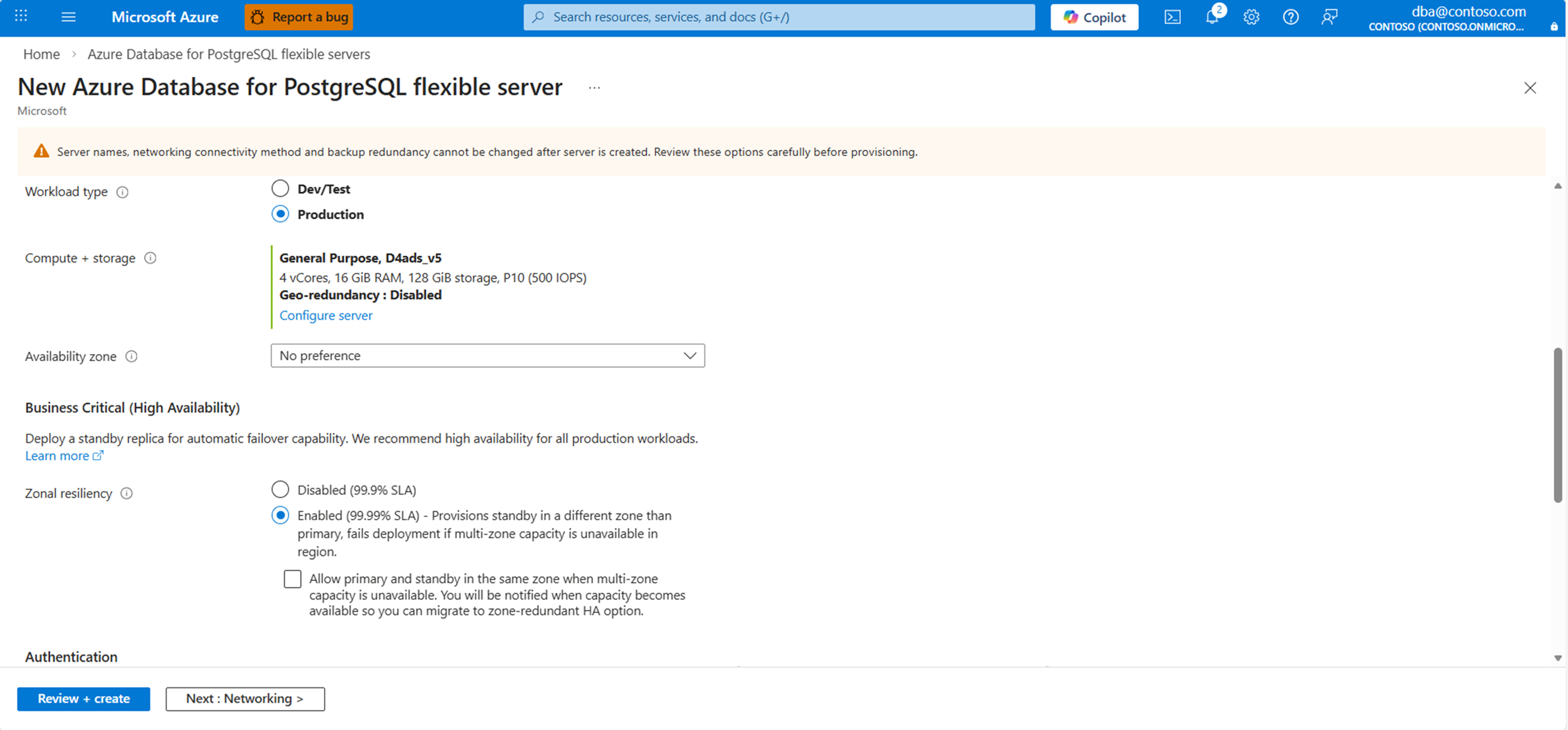 La sección "Crítico para la empresa (alta disponibilidad)" proporciona una opción para crear un servidor de alta disponibilidad en espera con configuración de resistencia zonal . Para simplificar la configuración y garantizar la resistencia zonal, el portal proporciona una opción resistencia zonal con dos botones de radio: Habilitado y Deshabilitado. Al seleccionar Habilitado, se intenta crear el servidor en espera en una zona de disponibilidad diferente (modo de alta disponibilidad con redundancia de zona). Si la región no admite alta disponibilidad (HA) con redundancia de zona, puede seleccionar la casilla de verificación de alternativa (resaltada en la siguiente imagen) para habilitar la alta disponibilidad en la misma zona.