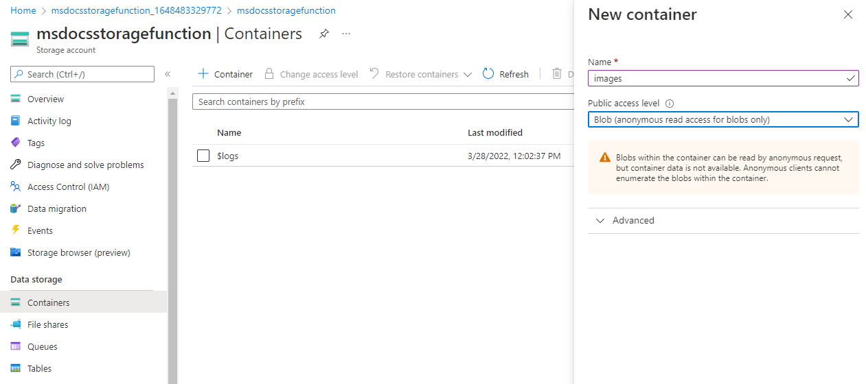 En la página Contenedores, seleccione + Contenedor en la parte superior. En el panel de diapositivas, escriba un Nombre de imageanalysis y asegúrese de que el Nivel de acceso público esté establecido en Blob (acceso de lectura anónimo solo para blobs). Seleccione Crear.