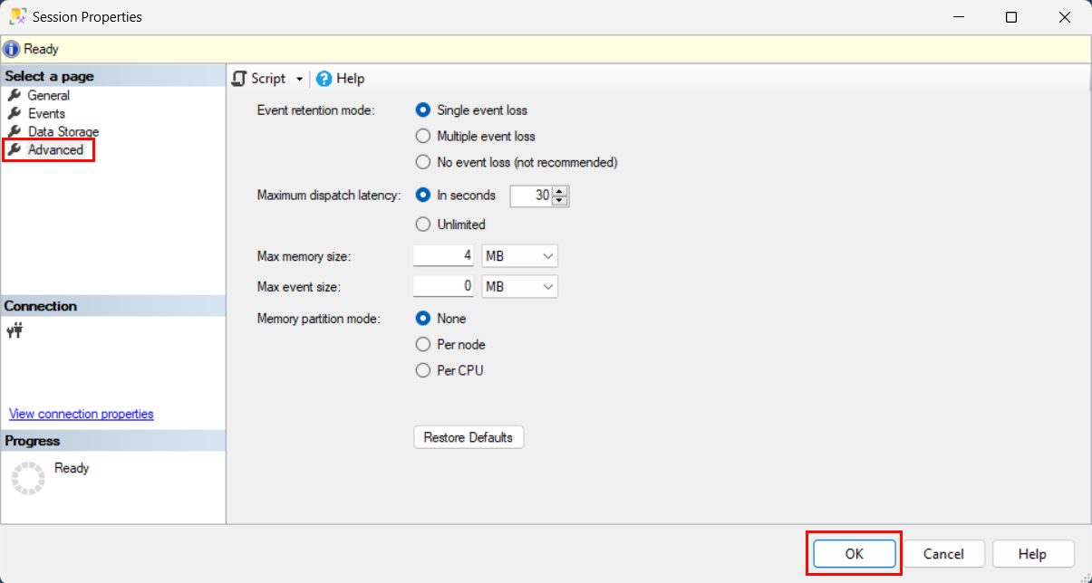 13. Seleccione la página Avanzadas. De forma predeterminada, este destino .xel de la sesión de eventos extendidos debe tener un impacto mínimo o no en el rendimiento del servidor, pero esta configuración en la página Avanzadas se puede usar para aumentar o reducir los recursos y la latencia.