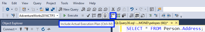En el menú Consulta, seleccione Incluir plan de ejecución real o seleccione el botón de la barra de herramientas Incluir plan de ejecución real.