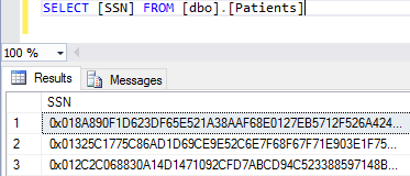 Suponiendo que SSN es una columna cifrada de la tabla Patients , la consulta que aparece a continuación recuperará los valores binarios de texto cifrado, si Always Encrypted está deshabilitado para la conexión de base de datos.