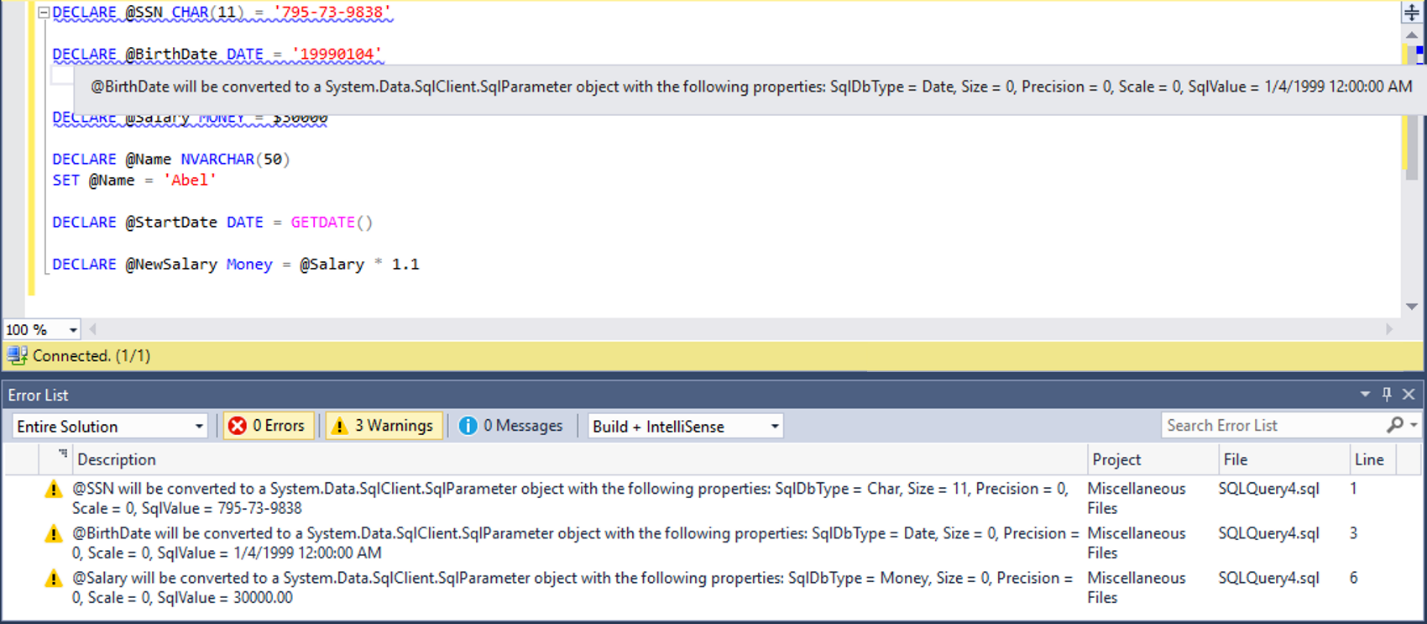 Una declaración de una variable que se puede parametrizar correctamente está marcada con un carácter de subrayado de advertencia en el Editor de consultas. Si mantiene el puntero sobre una instrucción de declaración que se marcó con un carácter de subrayado de advertencia, verá los resultados del proceso de parametrización, incluidos los valores de las propiedades clave del objeto SqlParameter resultante (al que se asigna la variable): SqlDbType, Size, Precision, Scale, SqlValue. También puede ver la lista completa de todas las variables que se parametrizaron correctamente en la pestaña Advertencia de la vista Lista de errores . Para abrir la vista Lista de errores , seleccione Vista en el menú principal y, luego, seleccione Lista de errores.