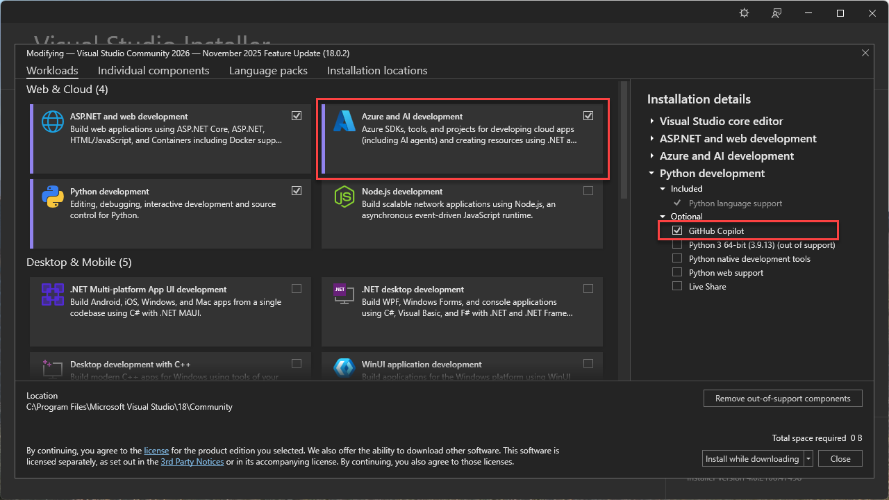 En el panel Detalles de instalación, compruebe que GitHub Copilot está seleccionado, que incluye los siguientes componentes: