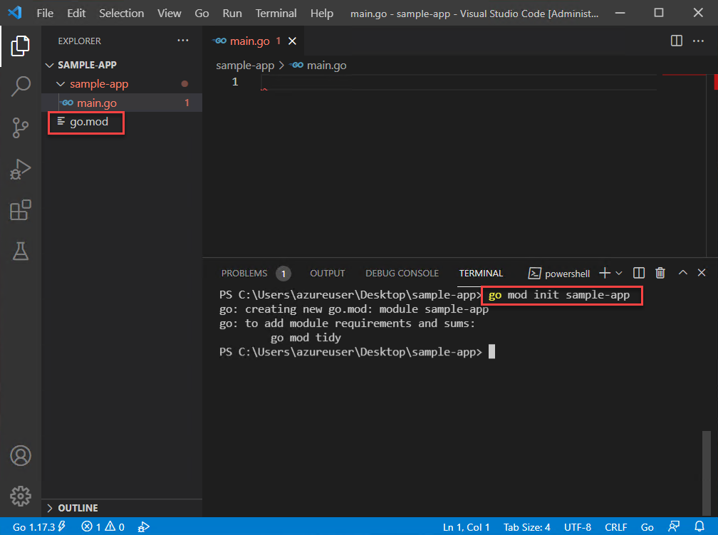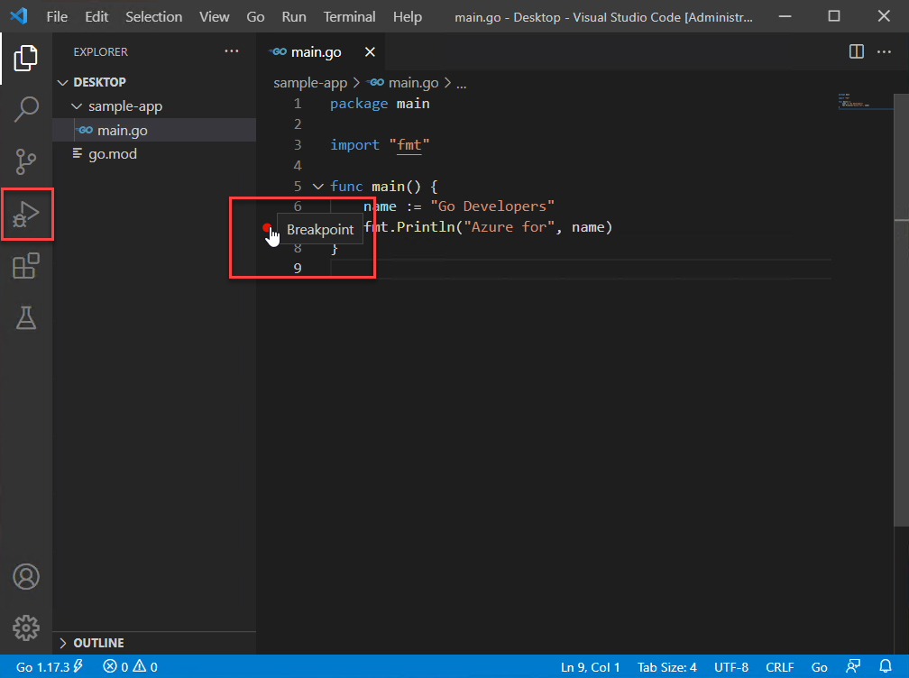 En este inicio rápido, instalará el compilador y las herramientas de Go, instalará Visual Studio Code para escribir código de Go e instalará la extensión Go para Visual Studio Code que proporciona compatibilidad al escribir Go. Una vez configurada, cree una aplicación, ejecútela y use la herramienta de depuración para pausar la ejecución y observar el valor de las variables.