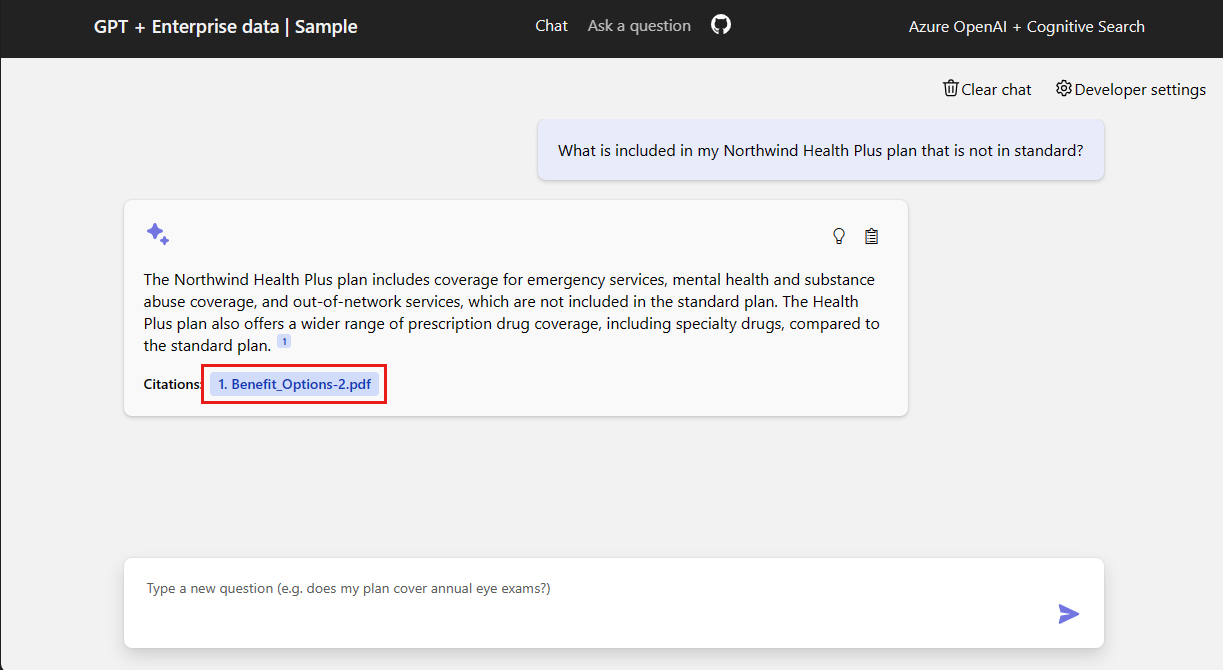 En el navegador, seleccione o introduzca ¿Qué incluye mi plan Northwind Health Plus que no esté en el estándar? en el cuadro de texto del chat.