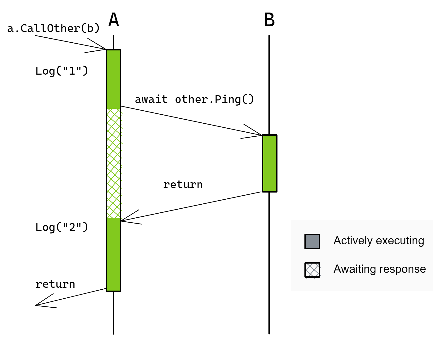 Las activaciones de grano tienen un modelo de ejecución de un solo subproceso . De forma predeterminada, procesan cada solicitud desde el principio hasta la finalización antes de que la siguiente solicitud pueda comenzar a procesarse. En algunas circunstancias, podría ser conveniente que una activación procese otras solicitudes mientras una solicitud espera a que se complete una operación asincrónica. Por este y otros motivos, Orleans proporciona algún control sobre el comportamiento de intercalación de solicitudes, tal como se describe en la sección Reentrancy. A continuación, se muestra un ejemplo de programación de solicitudes no reentrantes, que es el comportamiento predeterminado en Orleans.