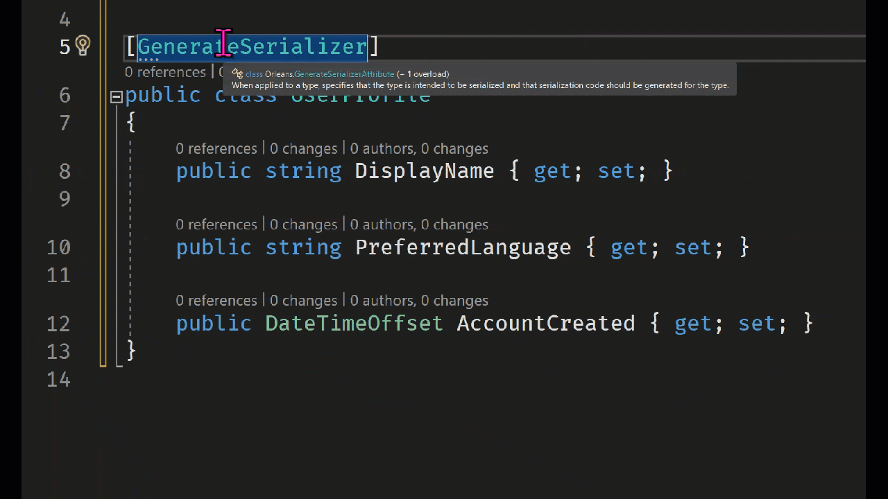 Para admitir la tolerancia a versiones, el serializador requiere que sea explícito sobre qué tipos y miembros se serializan. Hemos intentado hacer esto tan indoloro como sea posible. Marque todos los tipos serializables con Orleans.GenerateSerializerAttribute para indicar Orleans que genere código de serializador para el tipo. Una vez hecho esto, puede usar la corrección de código incluida para añadir el Orleans.IdAttribute requerido a los miembros serializables de sus tipos, como se muestra aquí: