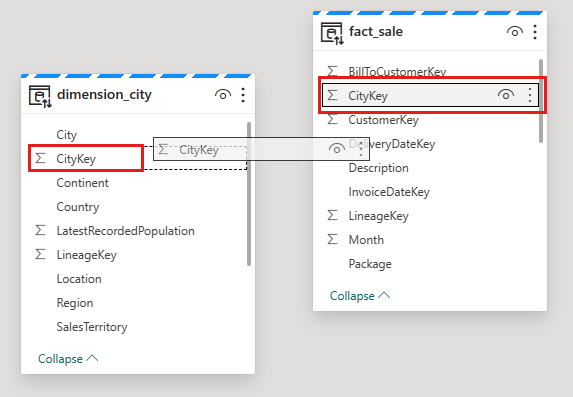 Para este modelo de datos, debe definir la relación entre diferentes tablas para que pueda crear informes y visualizaciones en función de los datos que proceden de tablas diferentes. Desde la tabla fact_sale, arrastre el campo CityKey y suéltelo en el campo CityKey en la tabla Dimension_City para crear una relación. Aparecerá el cuadro de diálogo Nueva relación.