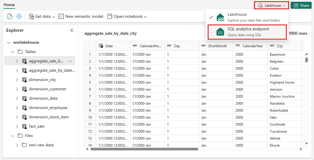 En wwilakehouse, seleccione punto de conexión de SQL Analytics en el menú desplegable Lakehouse en la parte superior derecha de la pantalla.