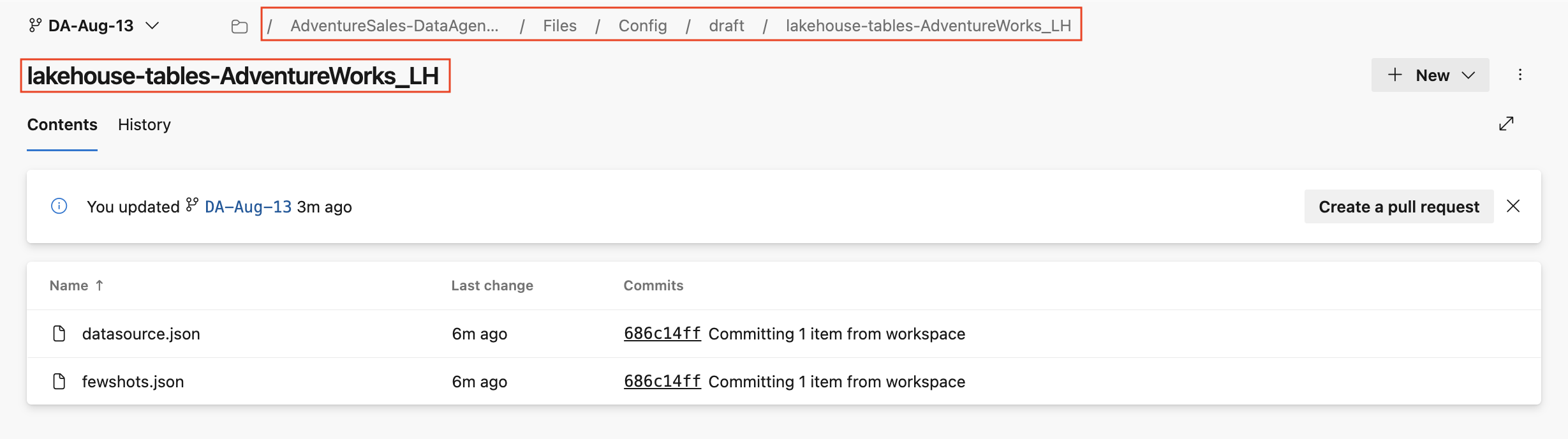 - El repositorio git vinculado muestra una estructura de carpetas que representa los elementos del área de trabajo, incluidos los agentes de datos de Fabric y sus archivos de configuración. Cada agente de datos se almacena en su propia carpeta, lo que le permite revisar los cambios, realizar un seguimiento del historial de versiones y usar flujos de trabajo de Git, como la creación de solicitudes de incorporación de cambios para combinar actualizaciones en la rama principal.