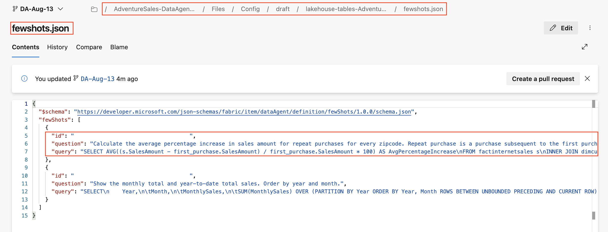 Cada carpeta del origen de datos contiene datasource.json y fewshots.json. Sin embargo, si el origen de datos es un modelo semántico, no admite consultas de ejemplo, por lo que su carpeta solo contiene datasource.json.