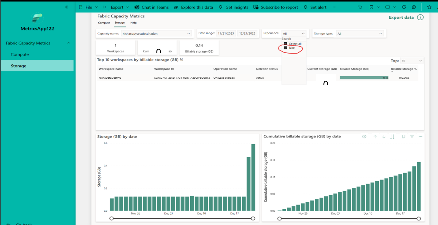 Si es administrador de capacidad, puede ver el consumo de almacenamiento en la aplicación Métricas de capacidad de Fabric. Abra la pestaña Almacenamiento y elija Experiencia como lago para ver el coste del almacenamiento de OneLake. Si tiene varias áreas de trabajo en la capacidad, puede ver el almacenamiento de cada una.