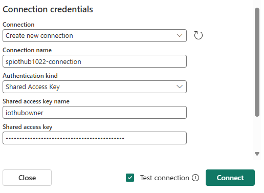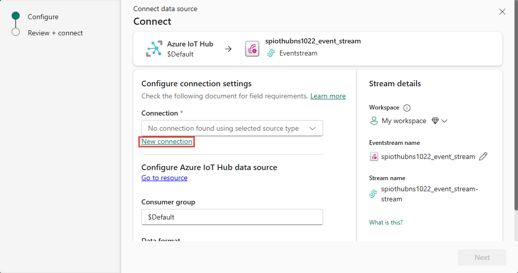 Si hay una conexión existente con tu instancia de Azure IoT Hub, selecciona esa conexión existente como se muestra en la siguiente imagen y, después, ve al paso para configurar el formato de datos.