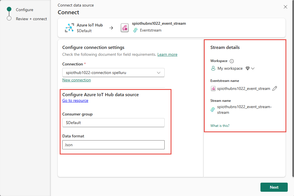 $Default, que es el grupo de consumidores predeterminado para el centro de IoT.Para Formato de datos, seleccione un formato de datos de los eventos entrantes en tiempo real que desee obtener de Azure IoT Hub. Puede seleccionar entre los formatos de datos JSON, Avro y CSV y, a continuación, seleccione Conectar.