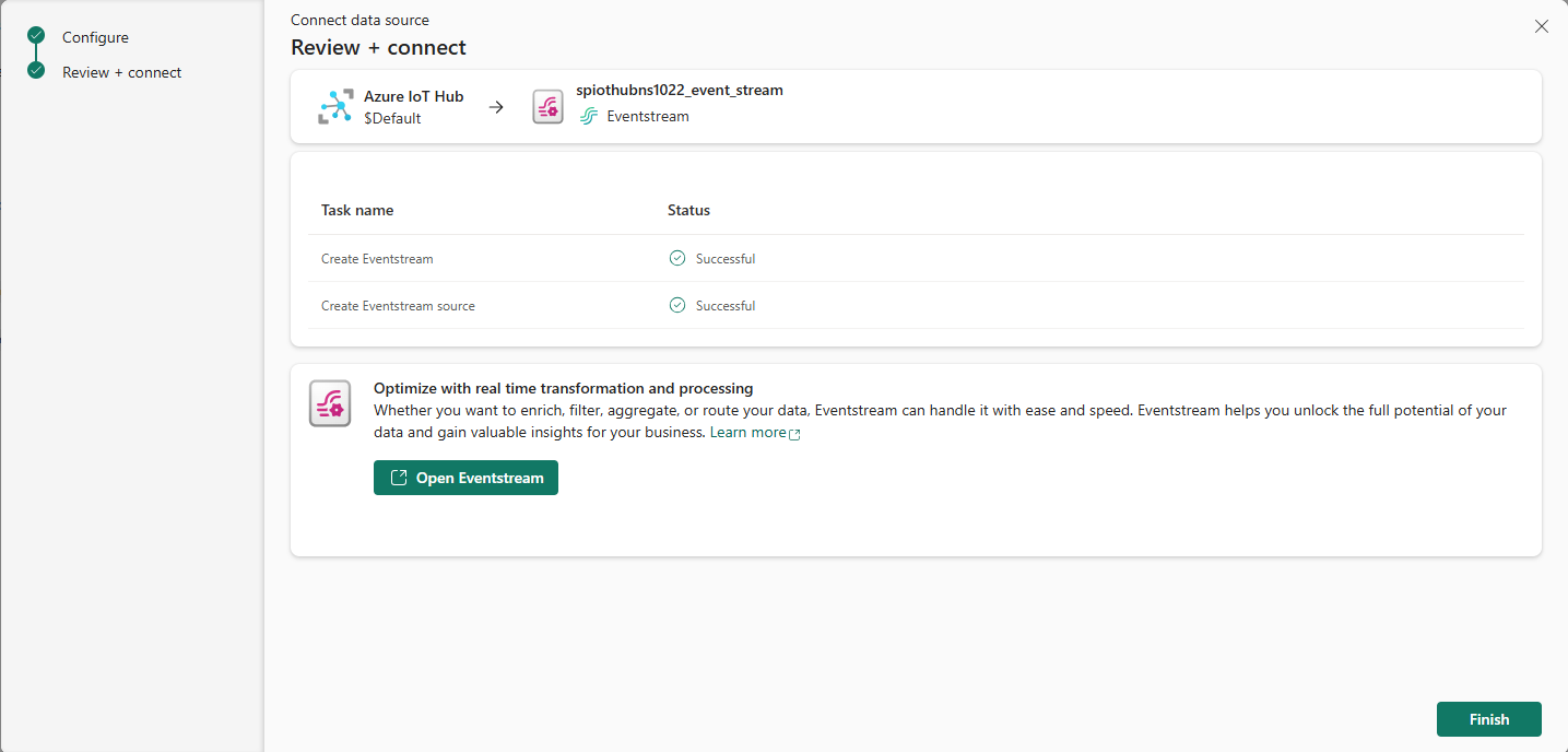 En la página Revisar y conectar, si seleccionas Abrir flujo de eventos, el asistente abre el flujo de eventos con la instancia de Azure IoT Hub seleccionada como origen. Para cerrar el asistente, selecciona Finalizar en la parte inferior de la página.