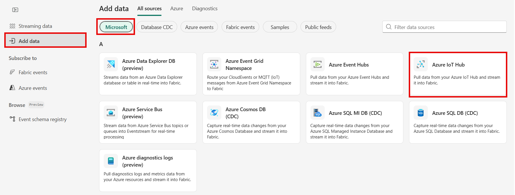 En la página Orígenes de datos, selecciona la categoría Orígenes de Microsoft en la parte superior y luego Conectar en el icono Azure IoT Hub.
