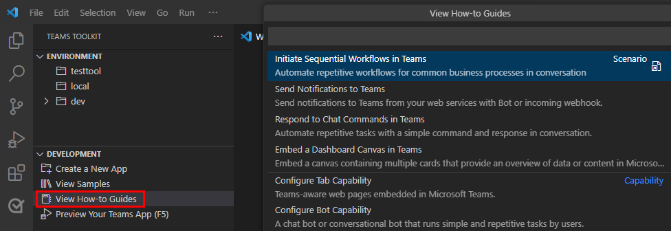 Seleccione Ver guías de procedimientos en el panel de tareas kit de herramientas de Teams en la sección DESARROLLO .