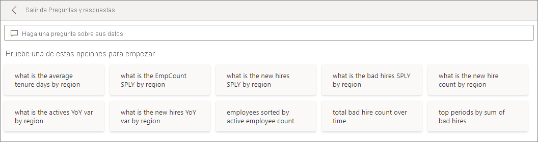 En el cuadro de preguntas y respuestas del panel, puede hacer una pregunta sobre sus datos mediante lenguaje natural. Q&A reconoce las palabras que escribe y descubre dónde en su modelo semántico encontrar la respuesta.