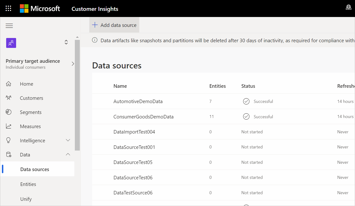 En el lado izquierdo de Customer Insights, seleccione Datos>Orígenes de datos.