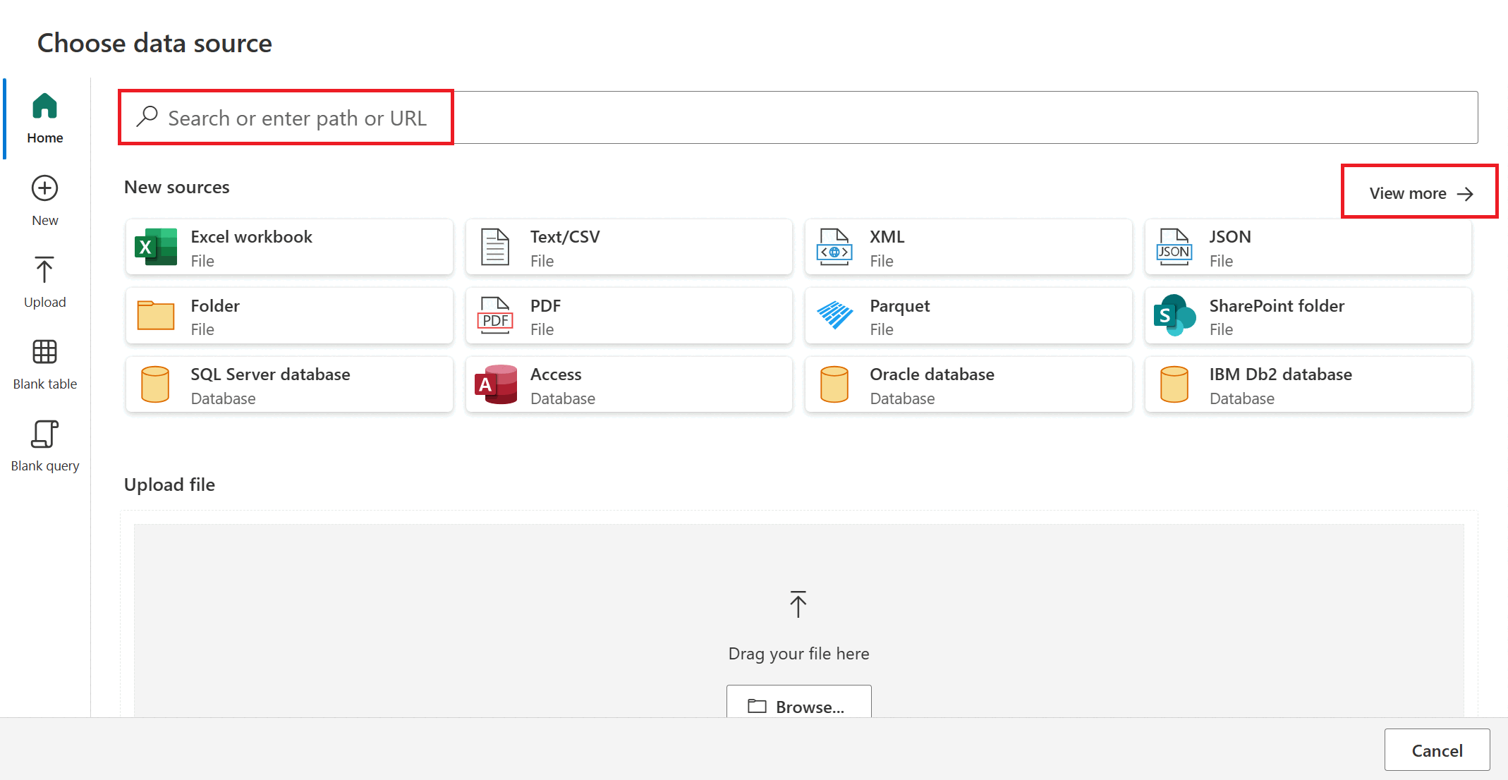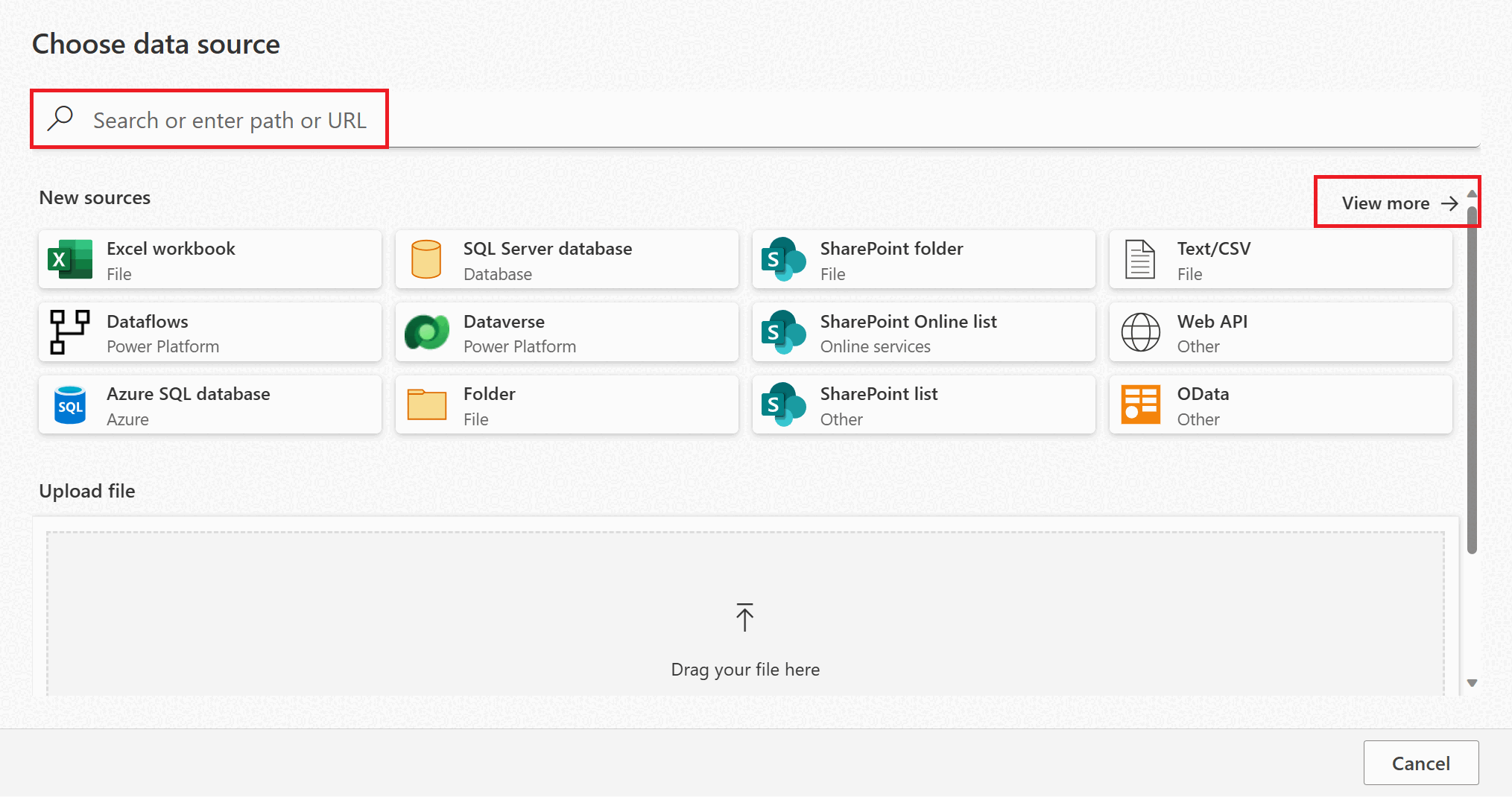 En la página Elegir origen de datos, use Buscar para buscar el nombre del conector o seleccione Ver más a la derecha del conector para ver una lista de todos los conectores disponibles en el servicio de Power BI.