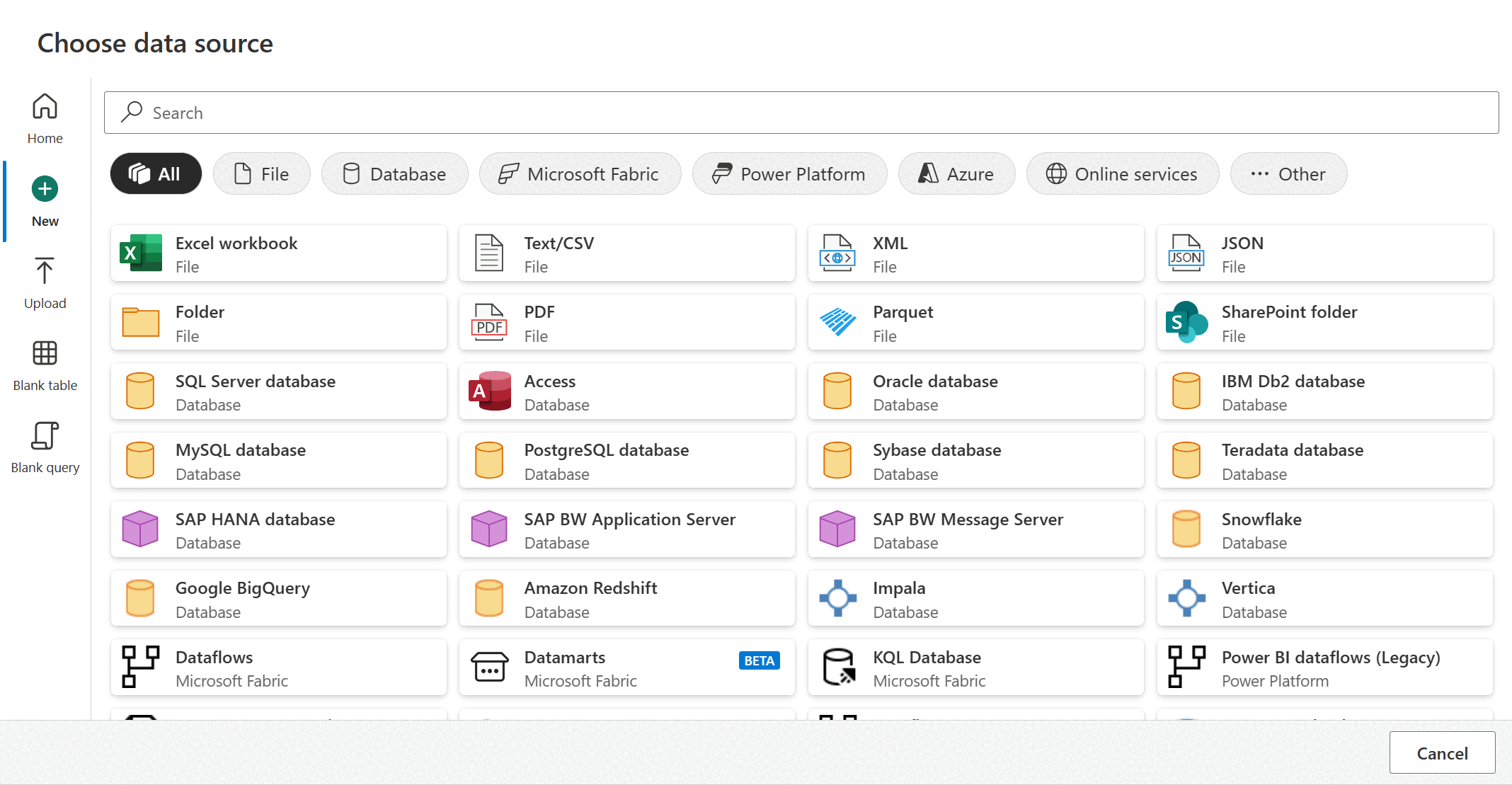 Cada una de las experiencias de obtención de datos de Power Query contiene diferentes conjuntos de características. Más información: Dónde puede usar Power Query?