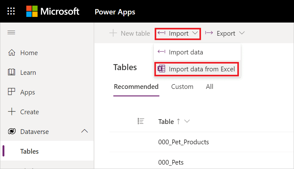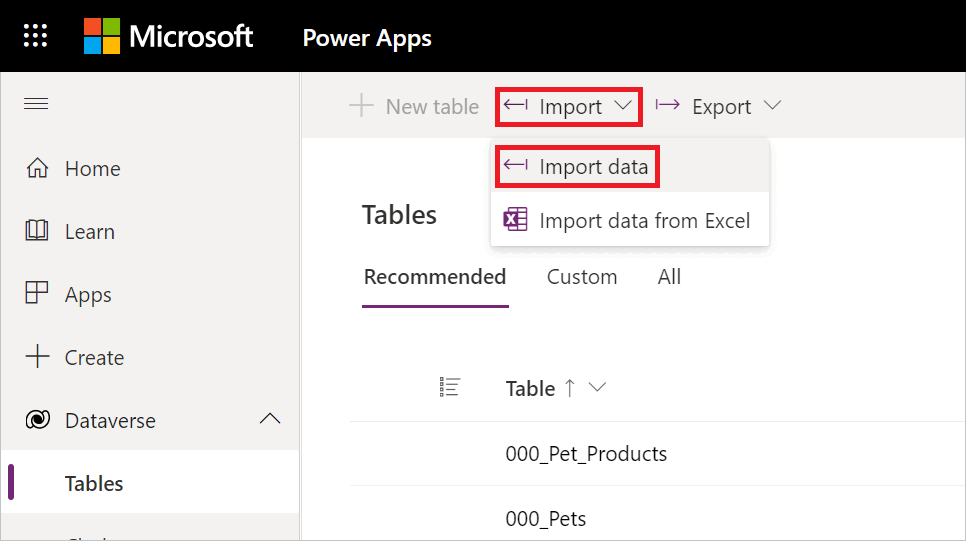 En la pestaña Power Apps, siga las instrucciones para importar datos a una nueva tabla o a una tabla existente en la sección Power Apps.