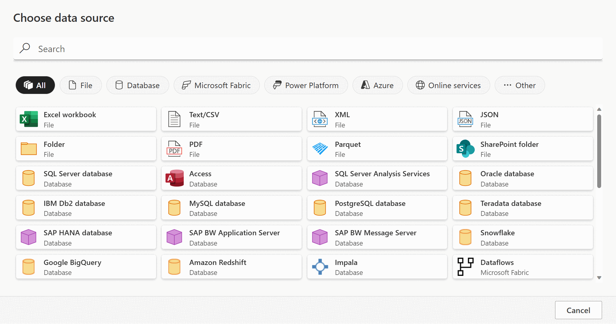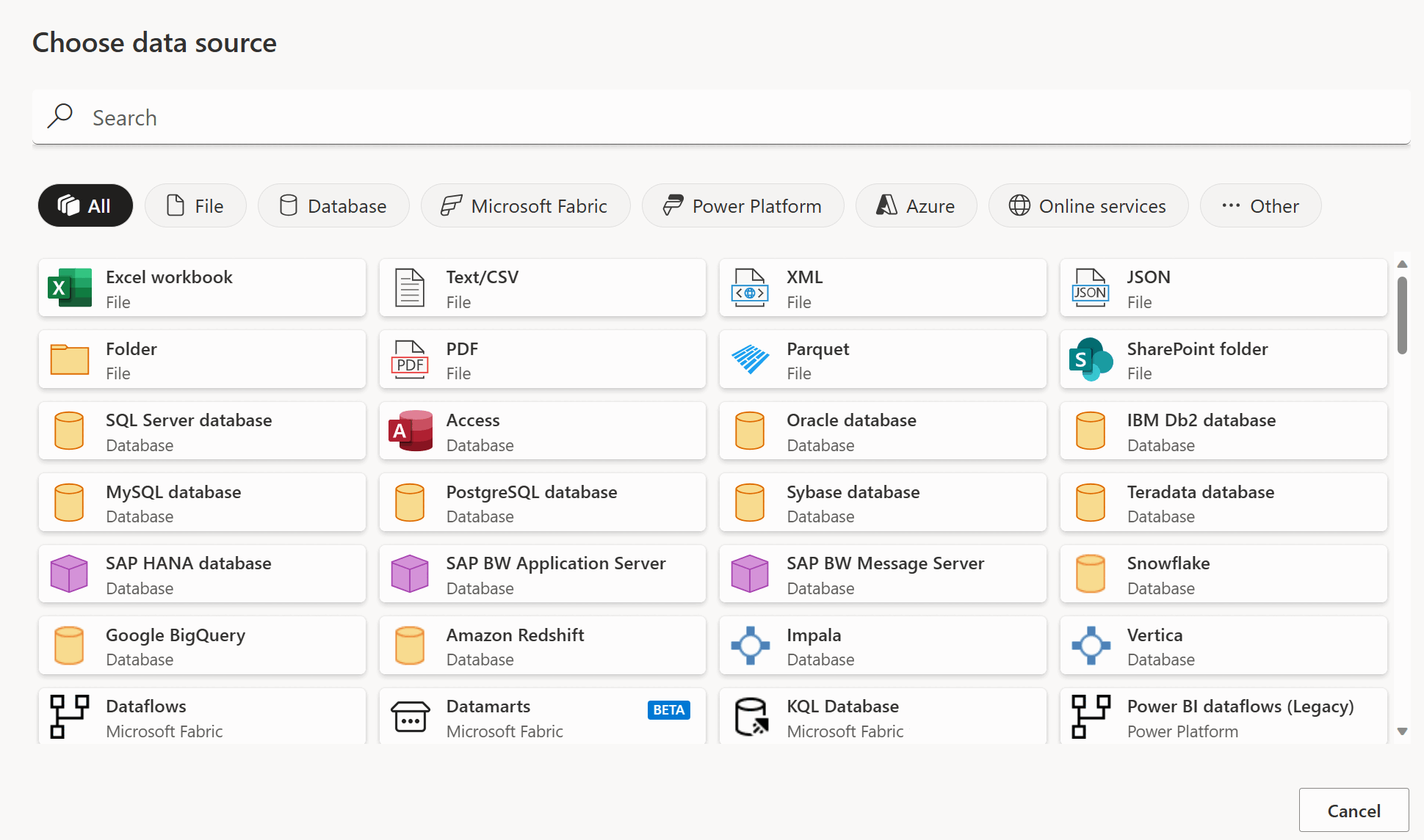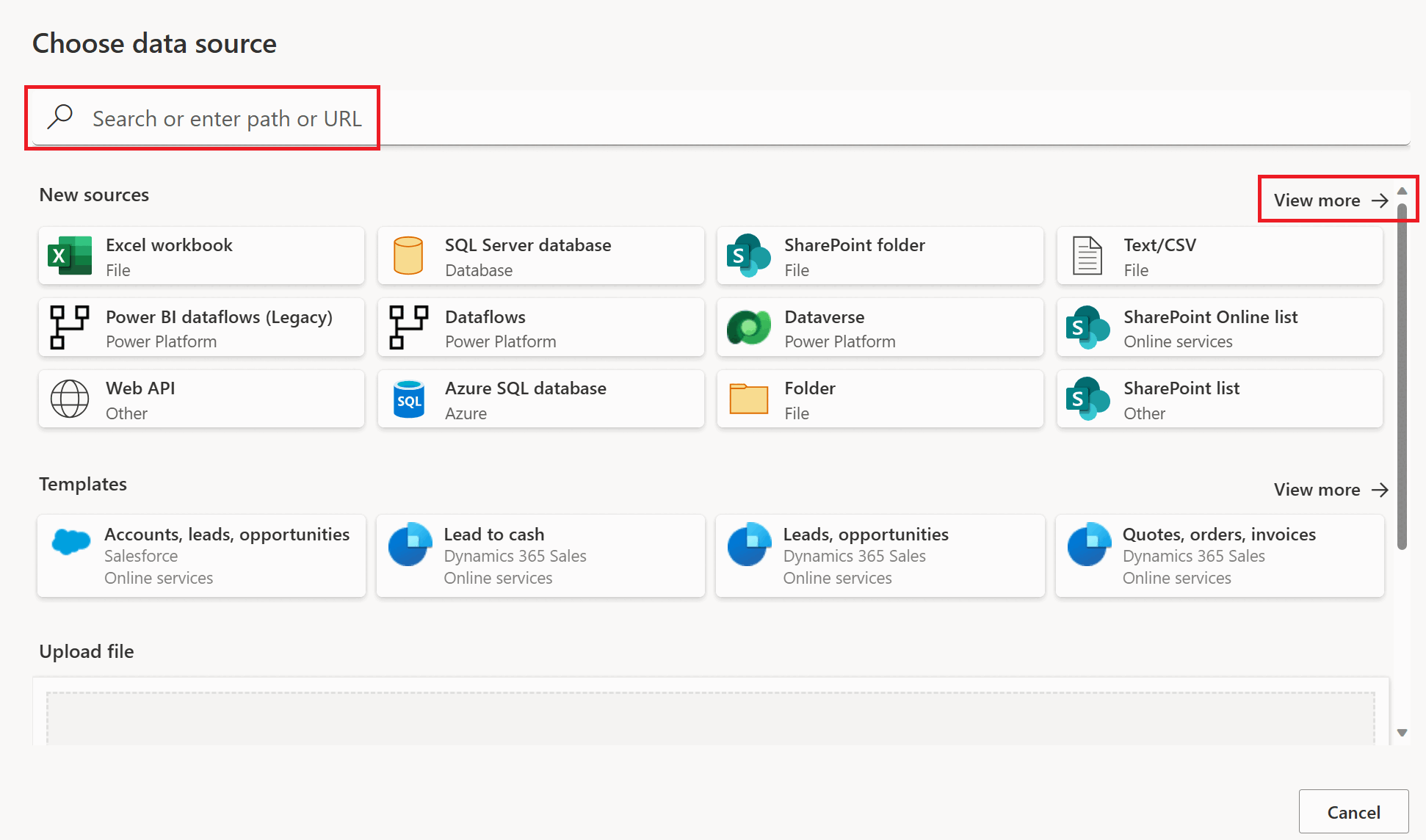 En la página Elegir fuente de datos, use Buscar para buscar el nombre del conector o seleccione Ver más a la derecha del conector para ver una lista de todos los conectores disponibles en el servicio de Power BI.