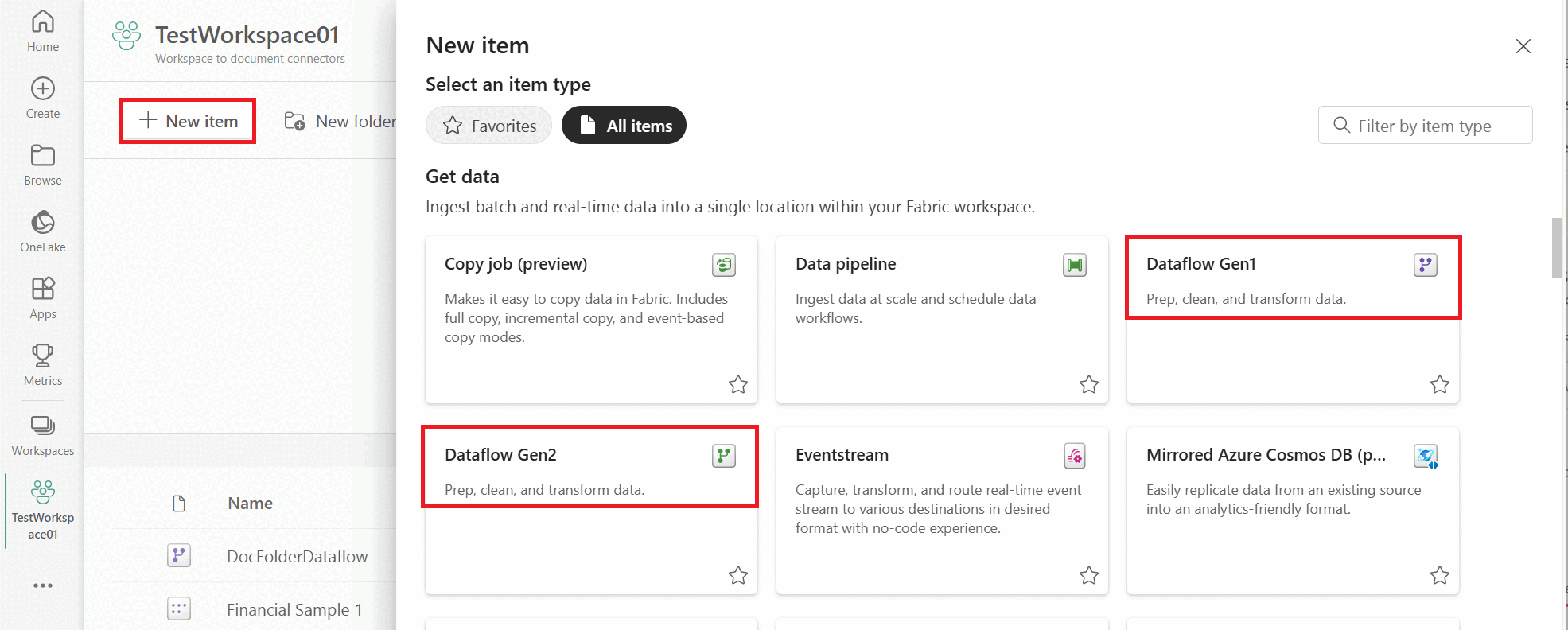 En la página Nuevo elemento, en Obtener datos, seleccione la versión del flujo de datos que desea usar (dataflow Gen1 o Dataflow Gen2).