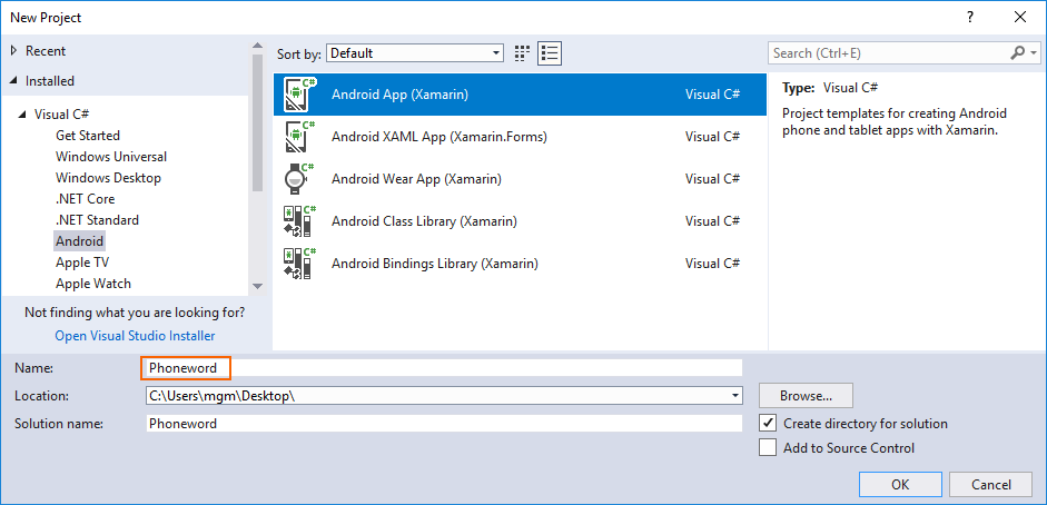 Asigne un nombre al nuevo proyecto Phoneword y haga clic en Aceptar: