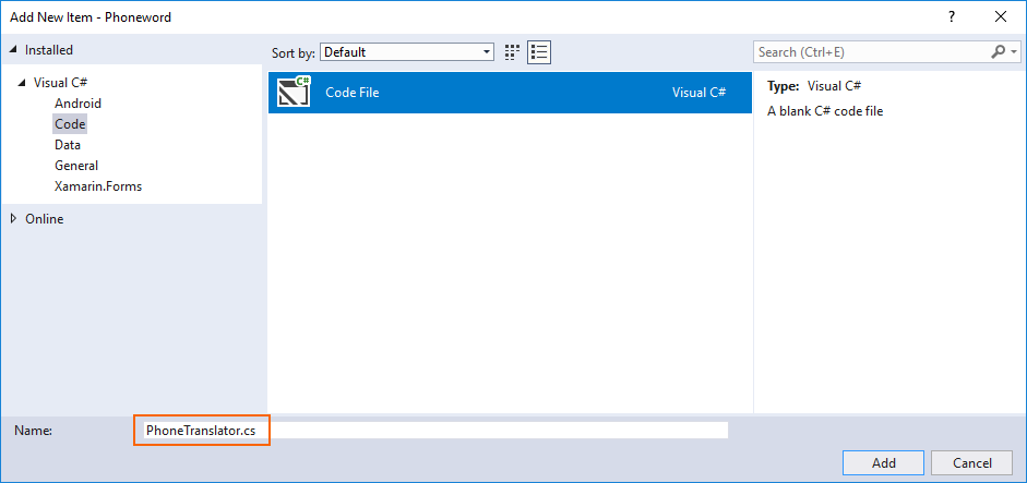 En el cuadro de diálogo Agregar nuevo elemento, seleccione Visual C# > Código > Archivo de código y asigne el nombre PhoneTranslator.cs al nuevo archivo de código: