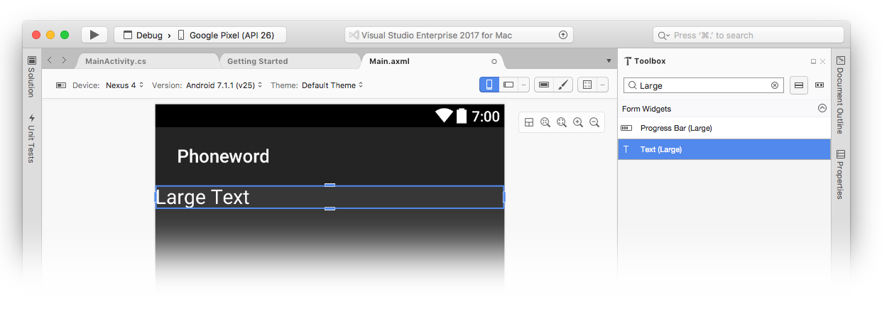 Con el widget de Texto (grande) seleccionado en la superficie de diseño, puede usar el panel Propiedades para cambiar la propiedad Text del widget de Texto (grande) a Enter a Phoneword: como se muestra a continuación: