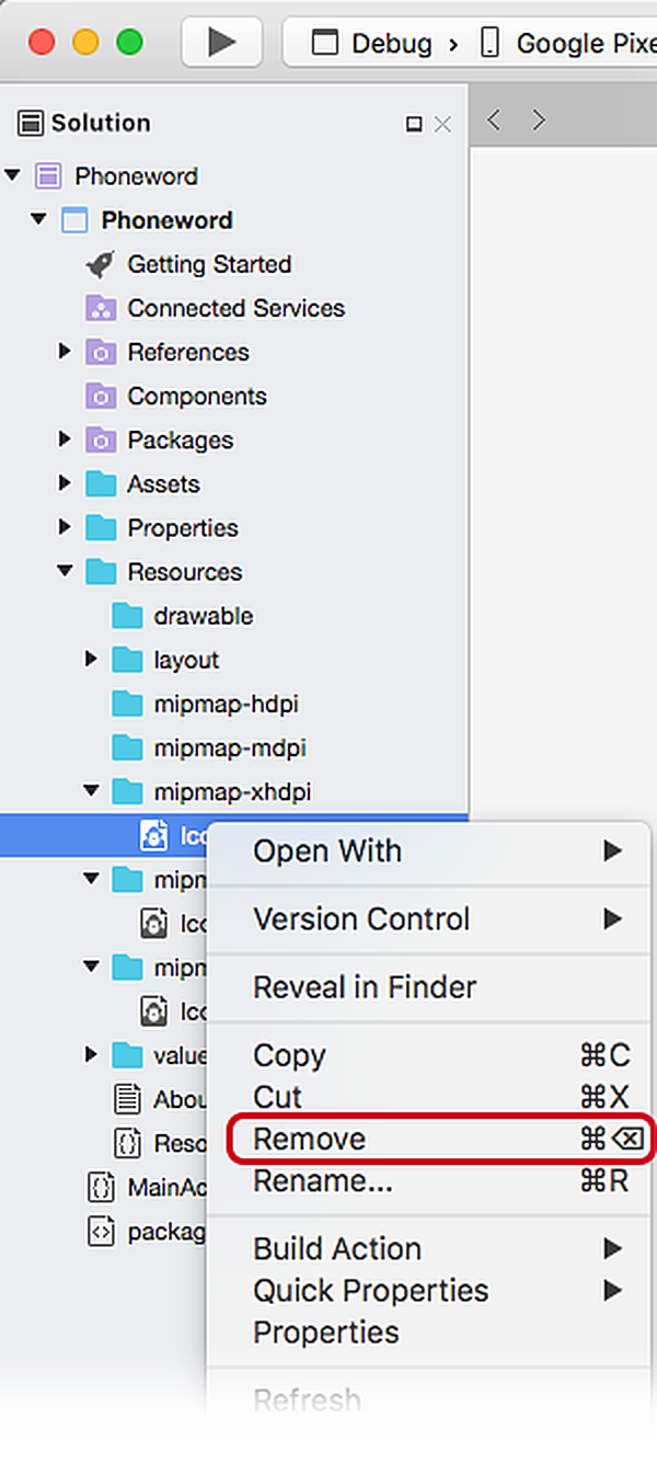 Repita estos pasos para cada una de las carpetas mipmap- hasta que el contenido de las carpetas de iconos de aplicación de Xamarin mipmap- se copie en las carpetas mipmap- equivalentes en el proyecto Phoneword.